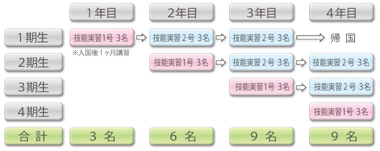 ※上記の枠を最大に活用した場合、3年間継続受け入れにより9人の受入れが可能になります。